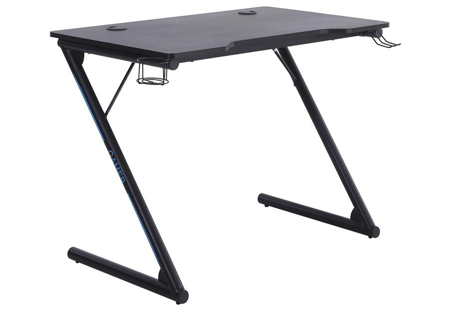 Biurko gamingowe PECTUS posiada blat z płyty MDF w kolorze czarnym. W blacie znajdują się dwa otwory na kable ułatwiające organizacje przestrzeni na biurku. Dodatkowo w skład wyposażenie wchodzi uchwyt na kubek oraz wieszak na słuchawki.