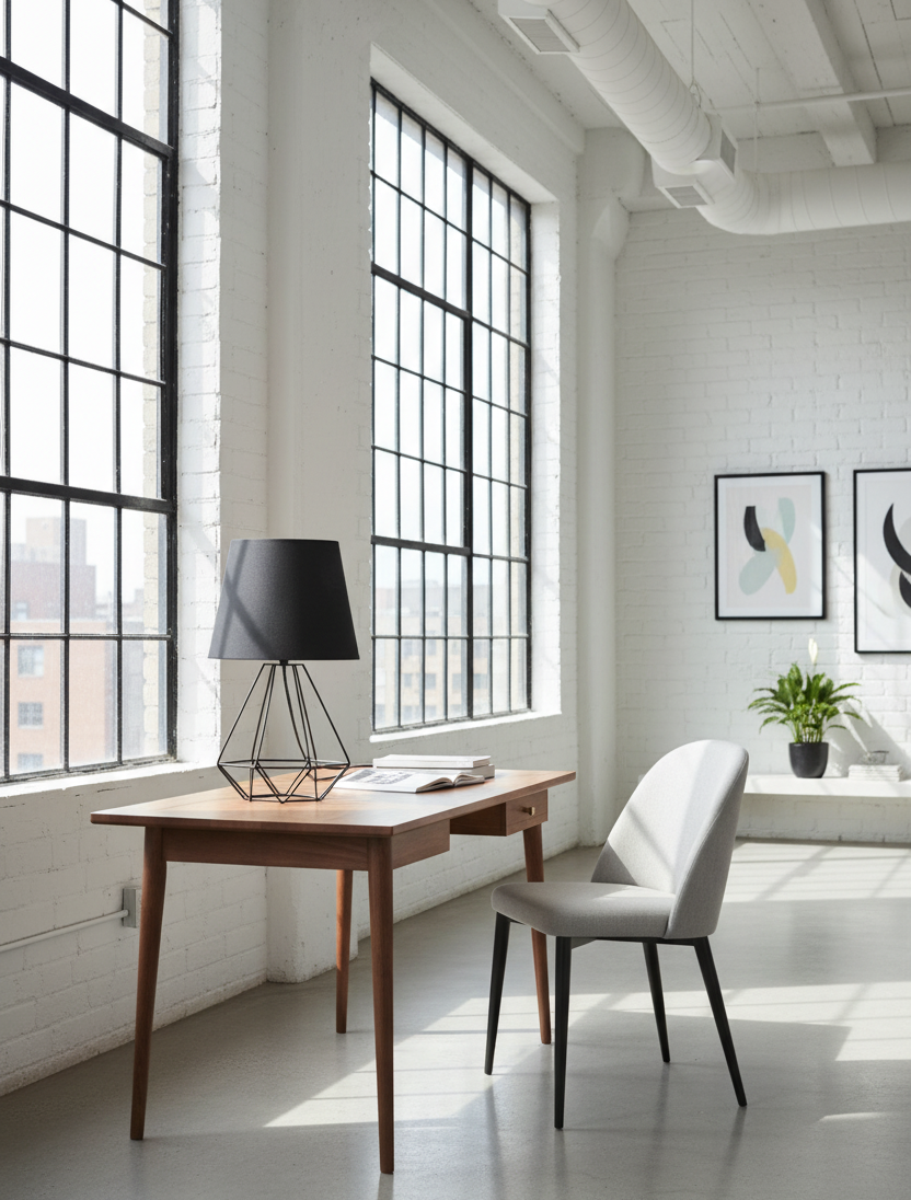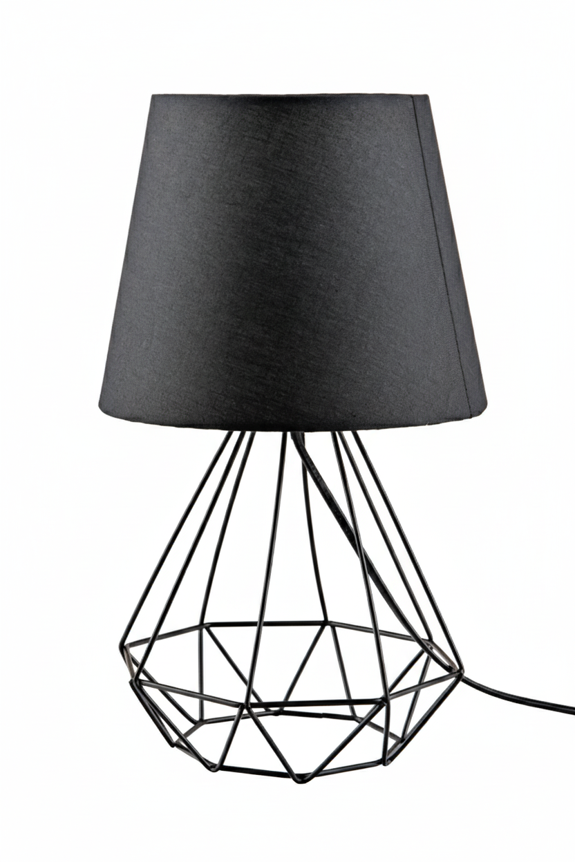 Największą ozdobą lampy jest nietypowa podstawa. Wykonana ze stali w kolorze czarnym. Wygięte stalowe druty przeplatają się ze sobą, tworząc efektowną kompozycję o industrialnym charakterze, którą wieńczy abażur o klasycznym kształcie z czarnej tkaniny. Lampa posiada pojedynczą oprawę z możliwością montażu żarówki o maksymalnej mocy 60W.